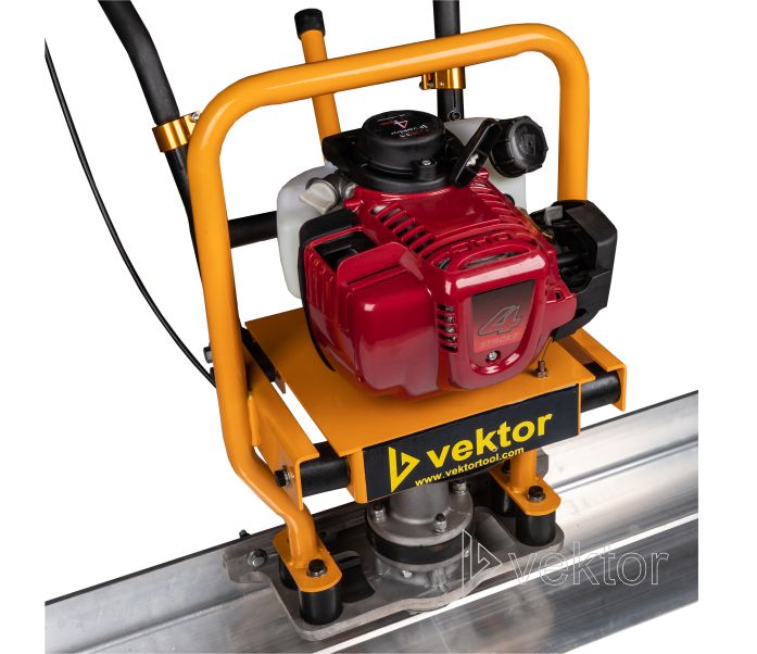 Привод к виброрейке Vektor VSG-2.5(N) представляет собой бензиновый четырехтактный двигатель мощностью 1,6 л.с, соединенный с эксцентриковым валом, от которого передается вибрация. В комплектации с алюминиевым профилем используется для выравнивания свежих бетонных поверхностей при строительстве дорог, мостов, парковок. Вибрация от привода равномерно распределяется по металлической поверхности рейки, воздействуя на верхний слой смеси. Бетонное покрытие становится гладким и прочным.