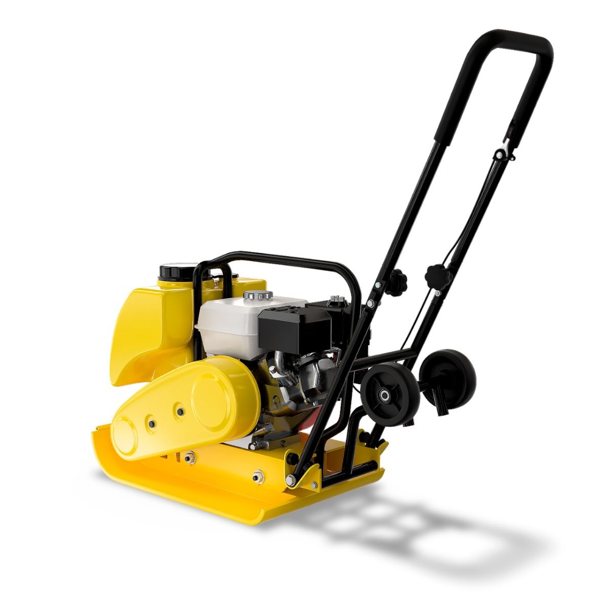 Складывающаяся ручка управления и колесо для перемещения упрощают транспортировку виброплиты.